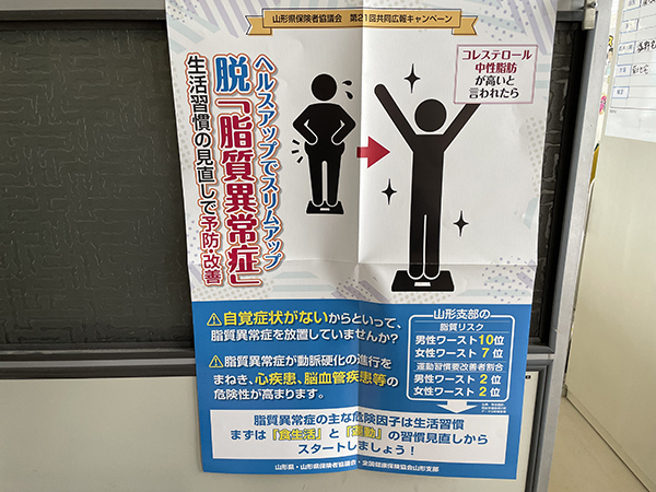 協会けんぽより、脱「脂質異常症」のポスターが届きましたので社内に掲示しますがこちらにも掲載しておきます。 山形の脂質リスクは男性ワースト10位、女性ワースト7位、運動習慣要改善者割…