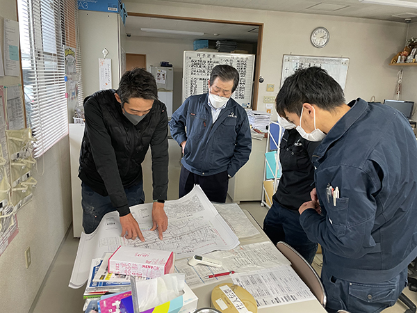 新しい契約が決まると、図面を拡げ、技術の共有を頻繁に行います。 前の工事の書類を整えながら、次の技術の検証を皆で行なう日々が技術者の日常です。 頭の切替を瞬時で行ない、これはこれ、…