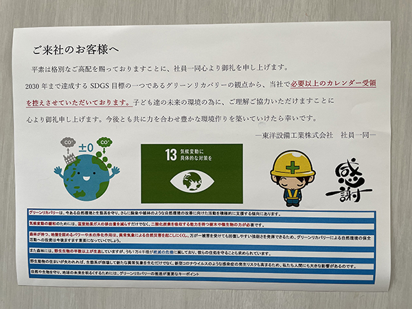 2022年12月15日 Team東洋設備 12月の恒例 12月も半ばを迎えると、お世話になっているお取引先様がご来社し、次々と来年のカレンダーを持参してくださいます。 しかし、当社で取り組んでいるSDGSの目標達成に向け、本年より必要以…